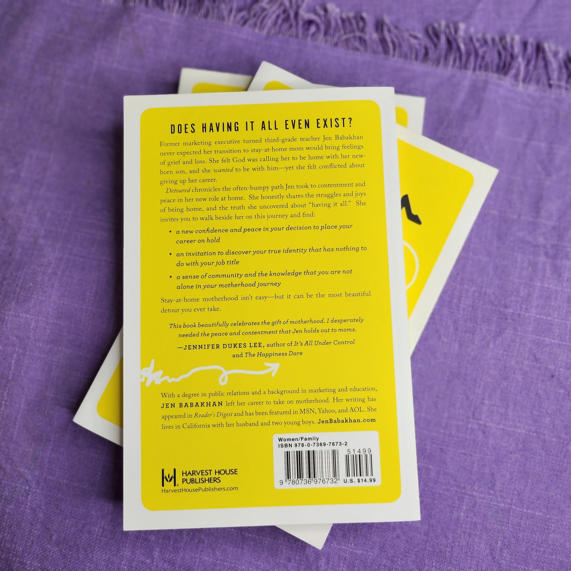You don't have to have it all to live the life you're called to live. In Detoured: The Messy, Grace-Filled Journey from Working Professional to Stay-at-Home Mom, Jen Babakhan shares her personal journey of leaving her career behind and becoming a stay-at-home mom, along with the emptiness that came along with the transition.